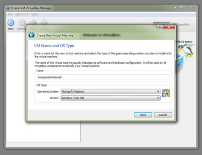 پس از نصب برنامه، آنرا اجرا کنید تا ساخت سیستم مجازی در کامپیوترتان را شروع کنیم. برای آغاز کار، روی دکمه بزرگ New در گوشه بالا و سمت چپ صفحهای که باز شده کلیک کنید. برای ماشین مجازیتان یک نام مناسب انتخاب کنید و در بخش انتخاب سیستمعامل، Windows 7 را برگزینید. اطمینان حاصل کنید که نوع سیستمعامل (32 یا 64 بیتی) با نسخه جاری ویندوز 8 که آنرا دانلود کردهاید، یکسان باشد.