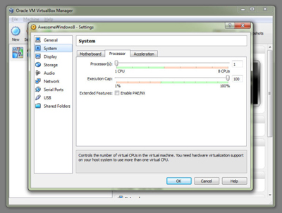 باز هم Next را بزنید تا ماشین مجازیتان ساخته شود. وقتی ماشین مجازی جدید آماده شد، در فهرست ماشینهای موجود در برنامه VirtualBox به نمایش درخواهد آمد. وقتی این مورد در فهرست نشان دادهشد، روی آن یک بار کلیک کرده یا به اصطلاح آنرا هایلایت کنید و دکمه بزرگ Settings را بزنید. اگر کامپیوتر شما از مجازیسازی سختافزار پشتیبانی کند، میتوانید توسط زیرمنوی System به ماشین مجازی اجازه بدهید تا به هستههای بیشتری از پردازنده دسترسی پیدا کند.