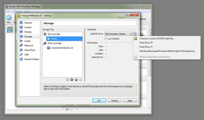حالا روی زیرمنوی Storage و بعد Empty در زیر IDF Controller کلیک کنید. روی آیکون کوچک به شکل CD که کنار فهرست درایو CD/DVD قرار دارد کلیک و گزینه Choose a virtual CD/DVD disk file را انتخاب کنید. فایل Windows 8 .iso را که پیشتر روی کامپیوترتان دانلود کردهبودید پیدا کرده و آنرا بارگذاری کنید. حالا روی دکمه بزرگ OK در پنجره سراسری Settings کلیک کنید.
