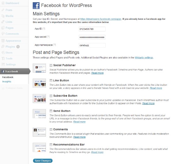 برای استفاده از تمامی امکانات موجود در این افزونه و اشتراک گذاری محتوای سایت خود در بین کاربران این شبکه مجازی به بهترین شکل ممکن نیاز است که برای سایت خود در فیس بوک ابتدا یک app جداگانه را راه اندازی کنید. برای این منظور با مراجعه به آدرس https://developers.facebook.com/apps و کلیک بر روی دکمه «ساختن برنامه‌ای نو» اقدام به ایجاد یک app جدید کنید و در نهایت نیز در همین صفحه اطلاعات مربوط برای استفاده در افزونه وردپرس مانند App ID، App Secret و app namespace به شما نمایش داده می‌شود.