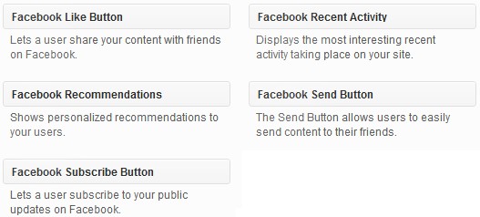 پس از نصب این افزونه در سایت وردپرس خود با رفتن به قسمت ابزارک ها نیز یک سری از ابزارک جدید را در رابطه با این شبکه مجازی خواهید دید که برای استفاده از آن‌ها کافی است بگویید در کدام یک از نوار کناری (Side Bar) سایت شما نمایش داده شوند. همان طور که در شکل زیر نیز مشاهده می‌کنید این ابزارک عبارتند از